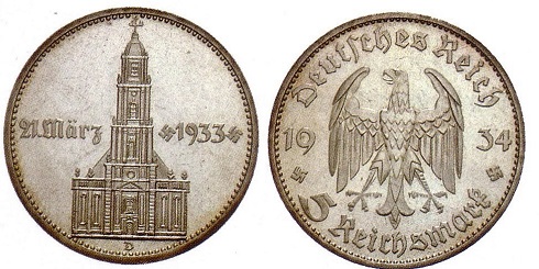 Außer den Gedenkausgaben zum 450. Geburtstag von Martin Luther und zum 175. Geburtstag von Friedrich Schiller gab es nach der so genannten Machtergreifung nur noch eine dritte Gedenkmünze. Sie zeigt die Potsdamer Garnisonkirche und trägt das Datum 21. März 1933 zwischen Hakenkreuzen. Mit der Silbermünze zu zwei und fünf Reichsmark wurde der "Tag von Potsdam" gefeiert, an dem die von großem Propagandageschrei begleitete Übergabe der Regierungsgewalt durch den Reichspräsidenten Paul von Hindenburg an Hitler erfolgte. Zu den Silberstücken in Auflagen von fünf beziehungsweise vier Millionen Exemplaren mit dem Datum 21. März 1933 kamen 1934 noch Fünf-Mark-Stücke mit der Garnisonkirche den Zeitbezug. Die freien Flächen neben der Kirche wurden gelegentlich zur antifaschistischen Propaganda genutzt. Unbekannte gravierten Parolen wie "Hitler verrecke" oder "Rot Front" dort ein.