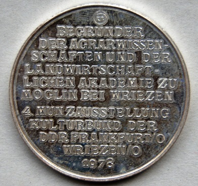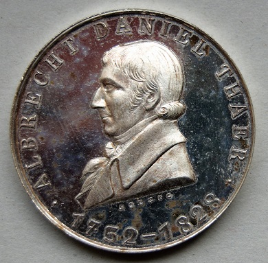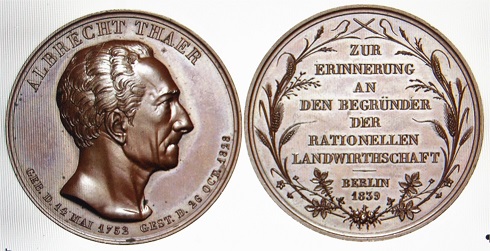 In Celle, Berlin und Leipzig errichtete man ihm zu Ehren Denkmäler, und auch eine Medaille wurde ihm 1839 posthum gewidmet. Geschaffen von dem bekannten Berliner Medailleur und Stempelschneider Henri François Brandt (1789-1845) im Auftrag der Landwirtschaftlichen Vereinigung Berlin, zeigt sie die markanten Gesichtszüge des Gelehrten, kombiniert mit der von Getreidehalmen eingefassten Widmung ZUR ERINNERUNG AN DEN BEGRÜNDER DER RATIONELLEN LANDWIRTHSCHAFT BERLIN 1839. Die in Silber und Kupfer ausgeführte Medaille reiht sich gut in eine Serie von Prägungen zu Ehren von Gelehrten und Künstlern ein. Wurden im 18. Jahrhundert neben Angehörigen des preußischen Königshauses vor allem hochrangige Militärs und verdienstvolle Minister durch Medaillen anlässlich von Dienstjubiläen, Geburtstagen und anderen Anlässen geehrt, so nahm nach 1800 die Zahl der "bürgerlichen" Medaillen stark zu. Führende Wissenschaftler und Künstler wurden auf ihnen in Verbindung mit sinnigen Allegorien und lobenden Widmungen als vorbildliche Persönlichkeiten dargestellt, denen Staat und Volk zu Dank verpflichtet sind.