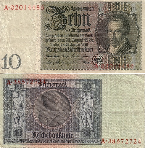 Nach der Überwindung der Inflation Ende 1923 wurden schnellstens neue Geldscheine benötigt, doch auch diese führten zunächst Altbewährtes mit der Wiedergabe von Bildnissen Hans Holbeins des Jüngeren fort. Mit dieser Auswahl konnten die Reichsbank sowie der Reichskunstwart als beratendes Organ nichts falsch machen, denn über den künstlerischen Wert dieser vielbewunderten Werke bestand Konsens. Im Sinne der zitierten Hinwendung zu "Persönlichkeiten aus dem Wirtschaftsleben" kam 1929 eine Reichsbanknote zu 10 RM mit dem Brustbild von Albrecht Daniel Thaer heraus. Passend zum Thema Landwirtschaft wurde auf die Rückseite das wie ein Medaillon gestaltete Bildnis einer jungen Frau gesetzt, die eben vom Schneiden des Getreides mit einer Sichel aufgestanden ist. Eingefasst wird diese Allegorie von Kindern, die einen Fisch beziehungsweise ein Füllhorn in Händen halten. Die Geldscheinserie wurde nach der Errichtung der NS-Diktatur fortgeführt mit einer Reichsbanknote zu 50 RM mit dem Bildnis des preußischen Kaufmanns, Bankiers und Politikers David Hansemann (1933), ferner zu 100 RM mit dem Porträt des Chemikers Justus von Liebig (1935) sowie zu 1000 RM mit dem Bildnis des preußischen Baumeisters Karl Friedrich Schinkel (1936).