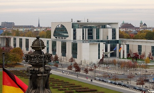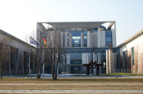 Das Bundeskanzleramt zwischen Moltkebrücke und Haus der Kulturen der Welt, Platz der Republik und Spree im Berliner Tiergarten erhielt bald nach seiner Eröffnung am 2. Mai 2001 vom Berliner Volksmund den Spitznamen Bundeswaschmaschine. Nach einem seinerzeit preisgekrönten Entwurf der Architekten Axel Schulte und Charlotte Frank zwischen 1997 bis 2001 errichtet, ist der Regierungssitz gegenüber dem Reichstagsgebäude als Sitz des Deutschen Bundestages ein städtebauliches Ausrufezeichen erster Ordnung, keineswegs ein Bürokomplex der üblichen Art. Entlang des Spreebogens erstreckt sich das "Band des Bundes", das die lange geteilte Ost- und die Westhälfte der Stadt über den Fluss hinweg verbindet. Unweit des Reichstagsgebäudes stehen drei nach bekannten Politikern bekannte Parlamentsbauten - das Paul-Löbe-Haus, das Marie-Elisabeth-Lüders-Haus und das Jakob-Kaiser-Haus - sowie weitere Bürohäuser der Abgeordneten und einzelner Ministerien. Die Baukosten sollen 465 Millionen Mark (umgerechnet rund 297 Millionen Euro) betragen haben, nach anderen Berechnungen sollen es über 510 Millionen Mark gewesen sein. Das wären etwa die Hälfte dessen gewesen, was der Neubau des Berliner Schlosses als künftiges Humboldt Forum verschlungen hat, und ein Bruchteil der Kosten für die Hamburger Elbphilharmonie.
