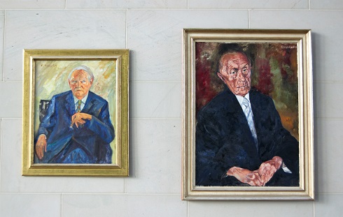 Ab und zu werden Besuchergruppen durch den riesigen Komplex geführt, und an Tagen der offenen Tür kann man auch einen Blick in die Arbeitsräume der Bundeskanzlerin und den großen Kabinettsaal tun. Bevor man das Amt etwa zu einer Pressekonferenz betreten kann, werden Mäntel und Taschen kontrolliert, und man muss auch eine Schleuse wie auf einem Flughafen passieren. Sicherheitspersonal oder Angestellte begleiten die Gäste zu dem Ort begleitet, an dem sie zu tun haben. Vorbei geht es im Eingangsbereich an einer riesigen "Philosophin" aus Bronze des Bildhauers Markus Lüpertz in die erste Etage. Dort kann man, rechts beginnend und links endend, eine kleine Gemäldegalerie mit Porträts früherer Bundeskanzler von Konrad Adenauer bis Gerhard Schröder betrachten. Der Platz für die seit 2005 regierende Bundeskanzlerin Angela Merkel ganz links ist noch frei. Die Anordnung von rechts nach links habe nichts mit der politischen Ausrichtung der betreffenden Politiker zu tun, ist beim Rundgang zu erfahren. Das Bildnis von Gerhard Schröder, der 2005 sein Amt an Angela Merkel abtreten musste, wirft Fragen auf. Von Jörg Immendorff geschaffen, umkreisen schemenhaft angedeutete Affenfiguren den wie ein Heiligenbild in Goldfarbe ausgeführten Kopf, während am unteren Ende ein Bundesadler und eine Fernsehkamera das Regierungsamt und eine beliebte Beschäftigung des damaligen "Medienkanzlers" mit SPD-Parteibuch andeuten.