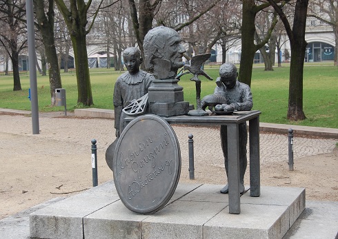 Zu James Simon passt ein anderer Menschenfreund - Adolph Diesterweg. Der Bildhauer Robert Metzkes hätte sich mit einer Büste vor einem Gebäude der Humboldt-Universität zu Diesterwegs 200. Geburtstag zufrieden geben können. Doch schuf der Bildhauer ein auf zwei niedrigen Stufen stehendes Ensemble mit Kindern und Tieren. Ein Junge im Pierrotkostüm mit einem Zweispitz in der Hand schaut gedankenversunken vor sich hin, ein anderer betrachtet ein kleines Gürteltier, das vor ihm auf dem Tisch läuft. Dazu kommen ein astronomisches Messgerät, eine Früchteschale, Tulpen sowie eine Taube, die gleich wegfliegen will. Die beiden Jungen würdigen Diesterwegs Büste, die wie zufällig auf dem Tisch steht, keines Blickes. Dass es sich um das Denkmal eines berühmten Lehrers und Schulreformers handelt, ist nicht sofort zu erkennen. Aufklärung gibt eine an den Tisch gelehnte ovale Tafel mit der Losung "Lebe im Ganzen! A. Diesterweg."
