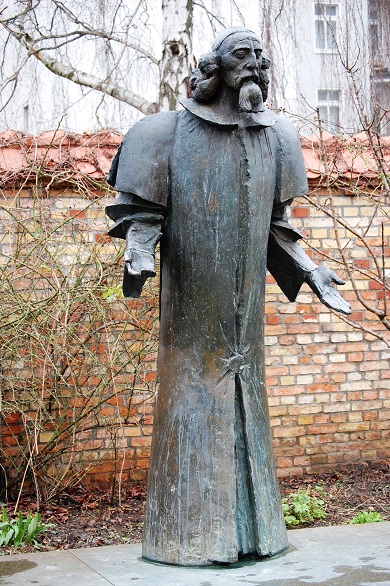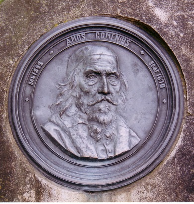 Obwohl schon einige Jahrzehnte tot, war Comenius für die hier vor den Toren der preußischen Residenz Anfang des 18. Jahrhunderts auf Befehl Friedrich Wilhelms I. angesiedelten böhmischen Glaubensflüchtlinge ein geistlicher Vater und moralischer Halt. Dem Monarchen wurde 1912 an der Kirchgasse nur wenige Schritte vom heutigen Comenius-Garten entfernt ein Bronzedenkmal gewidmet. An Jan Amos Comenius, der im Tschechischen Jan Amos Komenský heißt, erinnert außerdem ein Granitfindling mit bronzener Bildnisplakette an der Ecke Kirchgasse/Richardstraße, während er überlebensgroß, ein Käppchen auf dem Kopf und mit einem langen Mantel bekleidet auf einem flachen Sockel mitten in dem nach ihm benannten Garten gleichsam als Wächter und fürsorglicher Vater steht. Geschaffen wurde die bronzene Skulptur von dem Bildhauer Josef Vajce. Er hat das langbärtige Oberhaupt der Brüdergemeinde mit einer freundlichen Handbewegung dargestellt, als wolle er den Flaneur zu einer Disputation oder zum Besuch des Gottesdienstes einladen. Gemälde und in Kupfer gestochene Porträts, die Comenius mit einer solchen Geste darstellen, sind aus dem 17. Jahrhundert überliefert und dienten Vajce als Vorlagen.