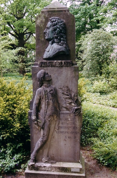 Der evangelische Theologe Johann Julius Hecker (1707-1768) gilt als Gründer der praxisorientierten Realschule und war auch der Schöpfer des ersten preußischen Lehrerseminars. An ihn erinnert im Garten des heute als Kunstgewerbemuseum genutzten Schlosses Köpenick ein Denkmal aus Stein. Ein junger Mann ehrt mit einem Lorbeerzweig den aus einer niederrheinischen Lehrerfamilie stammenden Hecker, dessen Bronzebildnis in den Stein eingelassen ist. Nach dem Studium der Theologie, alten Sprachen, Medizin und Naturwissenschaften in Hecker wurde Hecker 1735 zum Prediger, Lehrer und Inspektor des Militärwaisenhauses in Potsdam berufen und 1738 zum ersten Prediger an der Berliner Dreifaltigkeitskirche vom Soldatenkönig Friedrich Wilhelm I. ernannt, der Heckers Ideen sehr zugetan war und ihn in seinen Reformbemühungen unterstützte. Der Ruf erfolgte, nachdem der König von einer Predigt Heckers so beeindruckt war, dass er ihn beauftragte, Prediger an der neugebauten Dreifaltigkeitskirche zu Berlin z werden. "Er muß, wie er heute hier gethan, den Leuten auf der Friedrichstadt den Herrn Jesum predigen und sich der Jugend recht annehmen, denn daran ist das Meiste gelegen."