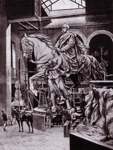 Mit der Entscheidung für die Einheitswippe ist eine von manchen Beobachter als geradezu irrwitzig bezeichnete Idee vom Tisch, statt des offiziell "Menschen in Bewegung" genannten Freiheits- und Einheitsdenkmals die nicht mehr vorhandene Säulenhalle des ehemaligen Kaiser-Wilhelm-Denkmals komplett neu aufzubauen. Wilhelm II., der Enkel des Monarchen, hatte das riesige Reitermonument mit einer eindrucksvollen Kolonnade im Hintergrund 22. März 1897 eingeweiht, dem einhundertsten Geburtstag des Königs von Preußen, der am 18. Januar 1871 in Versailles zum deutschen Kaiser ausgerufen wurde. Nach dem Zweiten Weltkrieg wurden die Bronzefiguren bis auf vier Löwen und einen Adler eingeschmolzen, und die steinerne Kulisse fiel der Spitzhacke und dem Schredder zum Opfer.
