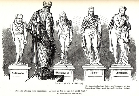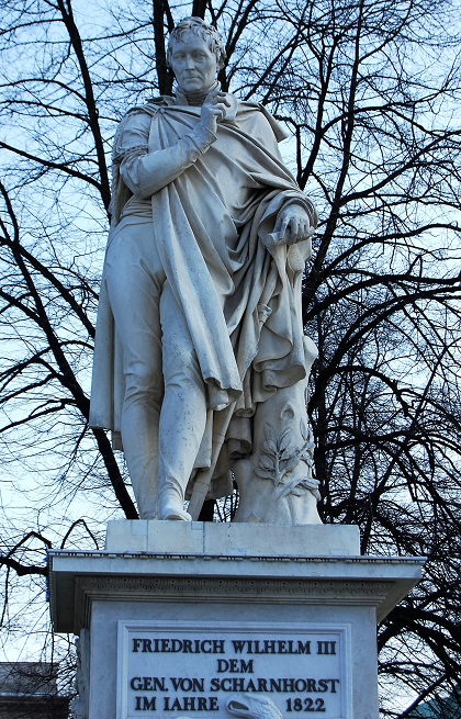 Im Jahre 1820 hatte der Bildhauer Rauch mit ersten Arbeiten für zwei Marmordenkmäler beiderseits der Schinkelschen Neuen Wache Unter den Linden begonnen. Gerhard David von Scharnhorst und Friedrich Wilhelm von Bülow von Dennewitz sollten hier auf Geheiß König Friedrich Wilhelms III. geehrt werden. Die Standbilder charakterisierten auf diese Weise die nach antiken Vorbildern zwischen 1816 und 1818 errichtete Unterkunft der Schlosswache als Erinnerungsmal an die Befreiungskriege. Rauch stellte Scharnhorst als Feldherren dar, der sich auf die kriegerische Tat vorbereitet. Ganz unmilitärisch, ja ein wenig lässig an einen Baumstamm gelehnt, sammelt er seine Gedanken. Die Haltung ähnelt der des friderzianischen Reitergenerals Hans-Joachim von Zieten in der kleinen Kuppelhalle des Bodemuseums beziehungsweise auf dem Zietenplatz, der von Johann Gottfried Schadow als nachdenklich dreinschauender "Bürger in Uniform" dargestellt wurde.