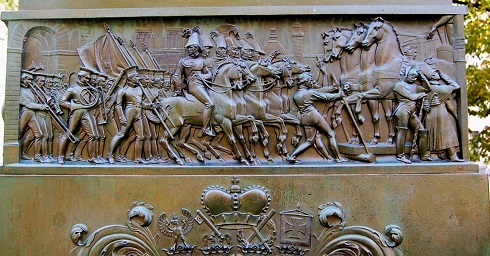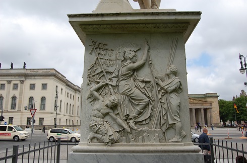 Auf einem schmalen Bilderfries rund um den Sockel erkennt man die Rekrutierung und Bewaffnung preußischer Soldaten, den Zug der Landsturmmänner, die Reiterei und Männer in einer Kampfespause. Auf der Seite zu den Linden ist der Einzug preußischer Truppen ins eroberte Paris zu sehen. Auf den Reliefs hat Rauch Zeitgenossen porträtiert - Theodor Körner, Wilhelm von Humboldt, die Militärs Gneisenau, Bülow und Yorck, aber auch Künstlerkollegen und Freunde. Karl Friedrich Schinkel lehnt sich lässig an ein Reitpferd, während Rauch selbst gerade dabei ist, die 1806 von Kaiser Napoleon I. nach Paris verschleppte Quadriga vom Brandenburger Tor wieder in Richtung Berlin zu rollen.