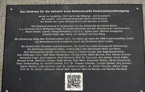 Die überlebensgroß an grünen Stängeln in den Himmel ragenden Blüten in den Regenbogenfarben ergänzen zwei schon länger an diesem Ort aufgestellte Metallstelen, die in Bild und Schrift an den Kampf gegen die Unterdrückung von Homosexuellen im Deutschen Reich während der Kaiserzeit und in der nationalsozialistischen Diktatur erinnern. Die Tafeln machen gleichzeitig darauf aufmerksam, dass es in Berlin eine starke Bewegung gab, die für die Rechte der Schwulen und Lesben überall auf der Welt kämpfte und für die Abschaffung diskriminierender Strafparagraphen eintrat. Eigentlich sollte es schon im Herbst 2016 eingeweiht werden, doch es gab Verzögerungen bei der Baugenehmigung. Die Gestaltung erfolgte in Verbindung mit der Universität der Künste Berlin durch eine Gruppe von Künstlerinnen und Künstlerinnen. Ihre Namen sowie die beteiligten Firmen und Institutionen sind in der Bodenplatte dankbar vermerkt.