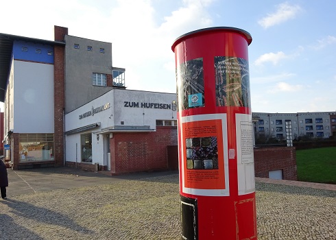 Indem bei den Stolperstein-Verlegungen aus der Lebensgeschichte der früheren Bewohner der Hufeisensiedlung berichtet wurde, riefen die Teilnehmer zu Mut, Wachsamkeit und Standfestigkeit auf. Dies tut auch eine Litfaßsäule an der Kreuzung Fritz-Reuter-Allee/Lowise-Reuter-Ring, die nicht nur über die Entstehungsgeschichte der 1927 bis 1931 nach Plänen von Bruno Taut und Martin Wagner erbauten Hufeisensiedlung berichtet, sondern auch darauf hinweist, dass hier viele Menschen gewohnt haben, die sich während der Weimarer Republik dem Kampf für die Verbesserung der sozialen Verhältnisse und gegen die drohende faschistische Gefahr verschrieben haben und während der NS-Diktatur Widerstand leisteten. Zu ihnen gehörten Heinrich Vogeler und Erich Mühsam. Nach 1933 haben die Nazis politisch und aus rassistischen Gründen missliebige Bewohner aus den Häusern vertrieben. Stramme Nazis machten sich in ihnen breit. Einer war der SS-Obersturmbannführer Adolf Eichmann, der als "Spediteur des Holocausts" auf schreckliche Weise in die Geschichte des 20. Jahrhunderts eingegangen ist.