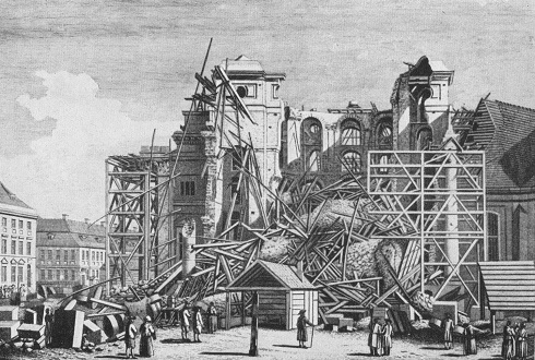 Fuchsteufelswild entließ der König, der ohnehin Architekten und Bauleuten misstraute und sie alle für Spitzbuben hielt, Gontard und betraute Georg Christian Unger mit dem Neubau. Eine obrigkeitliche Untersuchung ergab, dass der Deutsche Turm auf Grund von Materialmängeln, schlechter Gründung und nachlässiger Ausführung zusammengebrochen war. Beide Turmreste wurden abgetragen und unter Vermeidung der alten Fehler noch einmal errichtet und 1785 vollendet. Im Zweiten Weltkrieg zerstört, erlebten beide Kirchen und ihre mit vergoldeten Figuren gekrönten Türme in den 1980-er Jahren ihre Wiedergeburt.