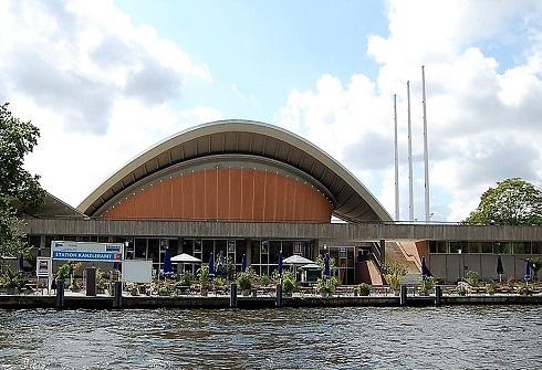 Das Haus der Kulturen der Welt steht am Rand eines künstlichen Hügels, so dass seine ungewöhnlichen Konturen auch im östlichen Teil der damaligen Viermächte-Stadt zu sehen waren.