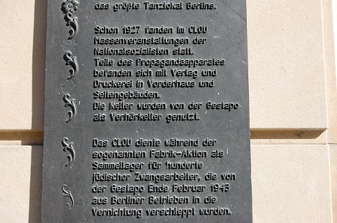 Die "braune" Vergangenheit der zum Tanzpalast verwandelten Markthalle III wird auf der erwähnten Tafel so beschrieben: "Schon 1927 fanden im CLOU Massenveranstaltungen der Nationalsozialisten statt. Teile des Propagandaapparates befanden sich mit Verlag und Druckerei in Vorderhaus und Seitengebäuden. Die Keller wurden von der Gestapo als Verhörkeller genutzt. Das Clou diente während der sogenannten Fabrik-Aktion als Sammellager für hunderte jüdische Zwangsarbeiter, die von der Gestapo Ende Februar 1943 aus Berliner Fabriken in die Vernichtung verschleppt wurden." Im Vorderhaus der ehemaligen Markthalle III sind heute unter anderem Kunstgalerien untergebracht. Zwischen 2011 und 2014 befand sich im Erdgeschoss eine Ausstellung zur Geschichte des Ministeriums für Staatssicherheit der DDR.