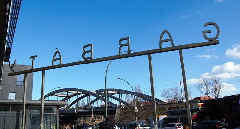 Vor dem S-Bahnhof Berlin-Pankow erinnern der Schriftzug, hier von der Rückseite aufgenommen, sowie die Schriftplatte im Boden an Josef Garbáty, dem Pankow viel zu verdanken hat.