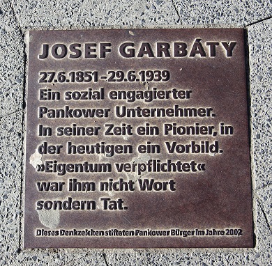 Josef Garbáty hatte es zum Waisenhaus und zum Betsaal nicht weit, denn um die Ecke, in der Hadlichstraße, befand sich seine Zigarettenfabrik. Ein wundervoll mit "jugendstiligen" Ornamenten und Schriftzügen geschmücktes Portal macht darauf aufmerksam, dass hier Zigaretten in riesigen Mengen produziert und von Pankow in alle Welt geliefert wurden. Bereits am S-Bahnhof Pankow wird man auf Garbáty durch einen großen Schriftzug in luftiger Höhe sowie eine in den Boden eingelassene Schrifttafel aus dem Jahr 2002 aufmerksam. Sie nennt die Lebensdaten des jüdischen Unternehmers und Menschenfreundes, dessen Lebensmotto "Eigentum verpflichtet" war.