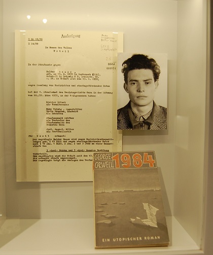 In der Berliner Kulturbrauerei schildert die Ausstellung "Alltag in der DDR", wie es 1959 dem jungen Drucker Baldur Haase erging, dem ein westdeutscher Brieffreund ein Exemplar des Orwellschen Buches "1984" geschenkt hatte. Wegen seiner Westkontakte ins Visier der Stasi geraten, angezeigt und in Gera vor Gericht gestellt, wurde der Neunzehnjährige wegen so genannter Nachrichtenübermittlung und staatsfeindlicher Hetze zu drei Jahren und drei Monaten Zuchthaus verurteilt. Baldur Haase veröffentlichte 2003 sein Buch "Briefe, die ins Zuchthaus führten: Orwells 1984 und die Stasi. DDR-Erinnerungen 1948-1961", Verlag Zeitgut - Schicksale Berlin, ISBN: 3-933336-32-5, 9,90 Euro).