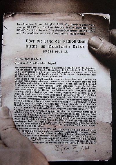 Die kirchenfeindlichen Vorgänge im Deutschen Reich blieben dem Vatikan nicht verborgen. In seiner Enzyklika "Mit brennender Sorge" prangerte Papst Pius XI. die Verstöße gegen das Reichskonkordat von 1933 und die Verfolgung von Geistlichen an, die sich nicht auf die Ideologie und Praxis des NS-Staates einlassen wollten. Das päpstliche Sendschreiben wurde insgeheim vervielfältigt und am 21. März 1937 zur gleichen Zeit in allen katholischen Kirchen verlesen, eine Unbotmäßigkeit, die Hitler und seine Leute zur Weißglut reizte und drastische Gegenmaßnahmen nach sich zog. "Mit brennender Sorge und steigendem Befremden beobachten Wir seit geraumer Zeit den Leidensweg der Kirche, die wachsende Bedrängnis der ihr in Gesinnung und Tat treubleibenden Bekenner und Bekennerinnen inmitten des Landes und des Volkes, dem St. Bonifatius einst die Licht- und Frohbotschaft von Christus und dem Reiche Gottes gebracht hat." Wer nach angeblich altgermanisch-vorchristlicher Vorstellung das düstere unpersönliche Schicksal an die Stelle des persönlichen Gottes rücke, schrieb das Kirchenoberhaupt weiter, der leugne Gottes Weisheit und Vorsehung, die kraftvoll und gütig von einem Ende der Welt zum anderen waltet und alles zum guten Ende leitet.