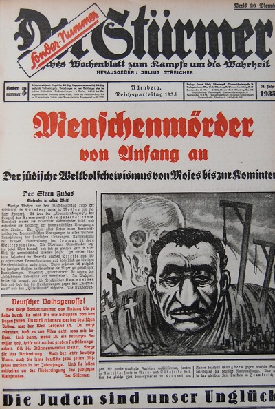 Einer der in Nürnberg angeklagten und dort am 1. November 1945 hingerichteten Hauptkriegsverbrecher war Julius Streicher, der Herausgeber des antijüdischen Hetzblattes "Der Stürmer". Unermüdlich hatte der Nazigauleiter von Nürnberg und Verleger die Todesstrafe für so genante jüdische Rassenschänder gefordert und behauptet, nur durch die Lösung der Judenfrage sei die "Erlösung" des deutschen Volkes möglich von allem Übel. Zu Streicher stellte der Internationale Militärgerichtshof fest, seine Aufreizung zum Mord und zur Ausrottung stelle ein Verbrechen gegen die Menschlichkeit dar. Als "Deutsches Wochenblatt im Kampfe um die Wahrheit" deklariert und mit Motto "Die Juden sind unser Unglück" versehen, das der bekannte Historiker Heinrich von Treitschke im 19. Jahrhundert ausgegeben hatte, behauptete "Der Stürmer" in unzähligen Varianten, Juden würden alles daran setzen, die nordisch-germanische Rasse und ihre Erbanlagen durch Geschlechtsverkehr und Vermischung des Blutes zu schädigen und so das deutsche Volk auszurotten. Angeblich genüge ein einziger Beischlaf eines Juden mit einer arischen Frau, "um deren Blut für immer zu vergiften. Sie hat mit dem ,artfremden' Eiweiß auch die fremde Seele in sich aufgenommen".
