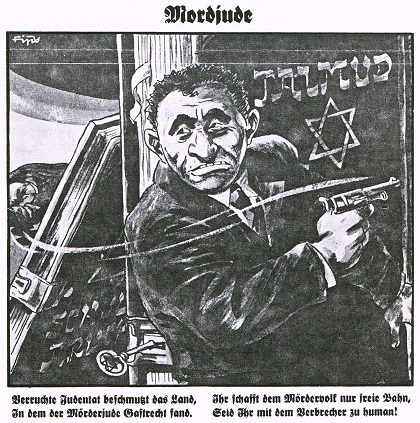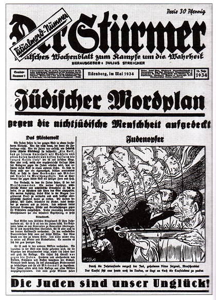 Einer der in Nürnberg angeklagten und dort am 16. Oktober 1946 hingerichteten Hauptkriegsverbrecher war Julius Streicher, Gauleiter von Nürnberg und Herausgeber des antijüdischen Hetzblattes "Der Stürmer". Über ihn stellte der Gerichtshof fest, seine Aufreizung zum Mord und zur Ausrottung der Juden sei ein Verbrechen gegen die Menschlichkeit gewesen. Als "Deutsches Wochenblatt im Kampfe um die Wahrheit" deklariert und mit dem von dem preußischen Historiker Heinrich von Treitschke übernommenen Motto "Die Juden sind unser Unglück" versehen, behauptete das Hetzblatt, Juden würden alles daran setzen, die nordisch-germanische Rasse und ihre Erbanlagen durch Geschlechtsverkehr und Vermischung des Blutes zu schädigen und auszurotten. Angeblich genüge ein einziger Beischlaf eines Juden mit einer arischen Frau, "um deren Blut für immer zu vergiften. Sie hat mit dem ,artfremden' Eiweiß auch die fremde Seele in sich aufgenommen".