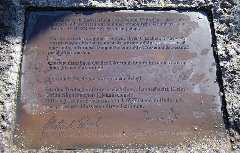 Die Inschriftentafel bedeckt den am 1. September 1989, dem 50. Jahrestag des Beginns des Zweiten Weltkriegs, gelegten Grundstein für die Topographie des Terrors.