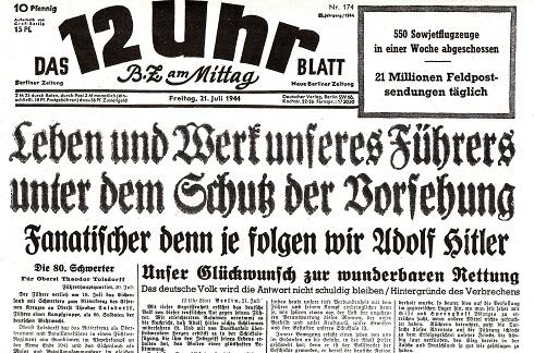 Am Abend des gescheiterten Attentats vom 20. Juli 1944 erklärte der leicht verletzte Hitle: "Eine ganze kleine Clique ehrgeiziger, gewissenloser und zugleich unvernünftiger, verbrecherisch-dummer Offiziere hat ein Komplott geschmiedet, um mich zu beseitigen und zugleich mit mir den Stab praktisch der deutschen Wehrmachtführung auszurotten. Die Bombe, die von dem Obersten Graf von Stauffenberg gelegt wurde, krepierte zwei Meter an meiner rechten Seite. Sie hat eine Reihe von mir teurer Mitarbeiter sehr schwer verletzt, einer ist gestorben. Ich selbst bin völlig unverletzt bis auf ganz kleine Hautabschürfungen, Prellungen oder Verbrennungen. Ich fasse das als eine Bestätigung des Auftrages der Vorsehung auf, mein Lebensziel weiter zu verfolgen, so wie ich es bisher getan habe. Denn ich darf vor der ganzen Nation es feierlich gestehen, dass ich seit dem Tage, an dem ich in die Wilhelmstraße einzog, nur einen einzigen Gedanken hatte, nach bestem Wissen und Gewissen meine Pflicht zu erfüllen, und dass ich, seit mir klar wurde, dass der Krieg ein unausbleiblicher war und nicht mehr aufgeschoben werden konnte, dass ich seit dem eigentlich nur in der Sorge, der Arbeit und der Sorge, und in zahllosen Tagen und durchwachten Nächten nur für mein Volk lebte! Es hat sich in einer Stunde, in der die deutschen Armeen in schwerstem Ringen stehen ähnlich wie in Italien, nun auch in Deutschland eine ganz kleine Gruppe gefunden, die nun glaubte, den Dolchstoß in den Rücken wie im Jahre 1918 führen zu können. Sie haben sich diesesmal aber sehr getäuscht." Die Behauptung dieser Usurpatoren, dass er nicht mehr lebe, werde in diesem Augenblick widerlegt. Die Attentäter hätten nichts mit der Wehrmacht und vor allem auch mit dem deutschen Heer zu tun, sagte Hitler und kündigte an: "Es ist ein ganz kleiner Klüngel verbrecherischer Elemente, die jetzt unbarmherzig ausgerottet werden."