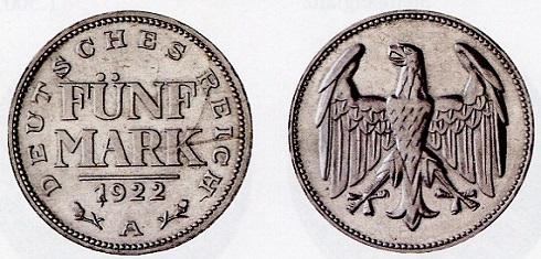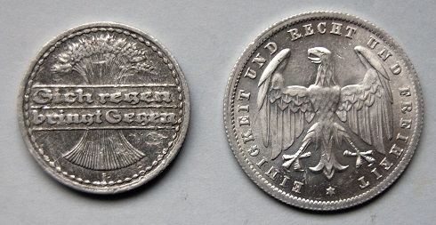 Erwähnt sei, dass die Aluminiummünze von 1922/2 ein Pendant hatte, nämlich ein Fünfzig-Pfennig-Stück mit den Jahreszahlen 1919, 1920, 1921 und 1922. Da im ersten Jahr der Weimarer Republik noch nach einem gültigen Hoheitszeichen gesucht wurde, denn der alte Kaiseradler sowie Kronen und Ordensketten waren obsolet, half man sich mit der Darstellung von Getreidegarben, auf die die doppelte Schriftzeile "Sich regen bringt Segen" gelegt wurde. Während der Verfassungstaler sowie ein ähnlich gestaltetes Drei-Mark-Stück ohne die auf den 11. August 1919 weisende Widmung eine schöne Antiquaschrift benutzen, hat der Berliner Stempelschneider Reinhard Kullrich eine von ihm entwickelte Fraktur eingraviert. Erst auf dem von Eddy Smith geschaffenen Drei-Mark-Stück von 1930 zum 700. Todestag des Minnesängers Walther von der Vogelweide findet man eine ähnliche "deutsche" Schrift. In der Zeit des Nationalsozialismus war sie obligatorisch. Zu der von Hitler befohlenen Umstellung auf die lateinische oder Antiquaschrift ist es in der Zeit des Zweiten Weltkriegs nicht gekommen. Hitler verschob diesen Plan auf die Zeit nach dem - dann nicht eingetretenen - Endsieg