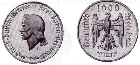 Viele der in Rudolf Schaafs Buch von 1979 über die deutschen Probemünzen seit 1871 aufgeführten Geldstücke sind Materialproben und deuten auf große Experimentierfreude sowohl in der Kaiserzeit als auch danach. So kommen die Drei-Mark-Stücke von 1922 und 1923 aus Aluminium auch als Abschläge aus Silber, Nickel und Kupfer pur sowie mit verschiedenen Metallplattierungen vor. Für das Jahr 1922, in dem die Geldentwertung bereits stark vorangeschritten war, sind Fünf-Mark-Stücke aus aluminiumplattiertem Kupfer oder Nickel überliefert, ja es gibt aus dem gleichen Jahr auch eine Ausgabe zu 1000 Markstück aus Aluminium beziehungsweise Silber mit dem Kopf von Friedrich Schiller und der Umschrift "Frei durch Vernunft, stark durch Gesetze". Schaaf zufolge wurden die Münzen im Brandschutt der Stuttgarter Münze gefunden; Exemplare befinden sich im Geldmuseum der Deutschen Bundesbank. Ein besonderer Anlass ist auf den Münzen nicht vermerkt, doch zeigt das Beispiel, wie sehr man in der Frühzeit der Weimarer Republik um Formen, Materialien und Themen gerungen hat.