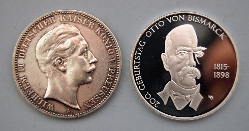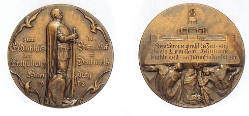 Otto von Bismarck war es nicht vergönnt, dass man ihn auch auf regulären Reichsmünzen dargestellt hat. Zwar erscheint er auf zahllosen Silberstücken, die fast so aussehen, als seien sie kurantes Geld. Die Gesetze ließen zu seinen Lebzeiten und bis ins frühe 20. Jahrhunderts nicht zu, dass man einen nicht regierenden Fürsten diese höchste numismatische Weihe gab. Als 1915 sein einhundertster Geburtstag gefeiert wurde, erwies sich die Idee, ihm eine Münze zu widmen, als nicht durchführbar. Vom Gesetz her wäre es möglich gewesen, analog zum Völkerschlachtdenkmal auf dem Drei-Mark-Stück von 1913 Hugo Lederers Hamburger Bismarck-Denkmal auf eine solche Münze zu setzen. Doch scheiterte der Plan, so ist in Kurt Jaegers Katalog "Die deutschen Münzen seit 1871" zu lesen, paradoxerweise an der übergroßen Popularität des Altreichskanzlers. Nach Meinung des Reichsschatzamt hätten im In- und Ausland mühelos Münzen im Nennwert von einhundert Millionen Mark abgesetzt werden können. Demgegenüber sei der Verkauf der 1913 geprägten Münzen auf die Befreiungskriege und zum silbernen Regierungsjubiläum Wilhelms II. mit je neun Millionen Mark zu gering gewesen. "Die sich darin spiegelnde größere Wertschätzung Bismarcks gegenüber dem Kaiser war für die damalige Zeit ein Grund, den Plan ganz aufzugeben", stellt Jaeger fest. Die Quelle für diesen Hinweis konnte bisher noch nicht gefunden werden.