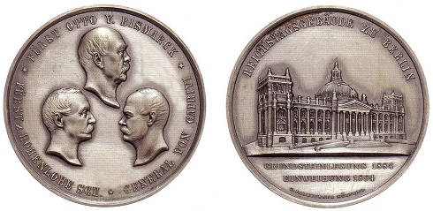 Die Eröffnung des Berliner Reichstagsgebäudes im Jahr 1894 nach zehnjähriger Bauzeit wurde, wie andere herausragende Ereignisse des wilhelminischen Reiches, durch Medaillen gefeiert. Auf den Prägungen erscheinen die Spitzen des Reiches - Kaiser Wilhelm II., "Fürst Bismarck der Baumeister des Deutschen Reiches" allein sowie die drei ersten Reichskanzler Bismarck, Caprivi und Hohenlohe, während auf der Rückseite der nach Plänen von Paul Wallot errichtete Parlamentsbau dargestellt ist.
