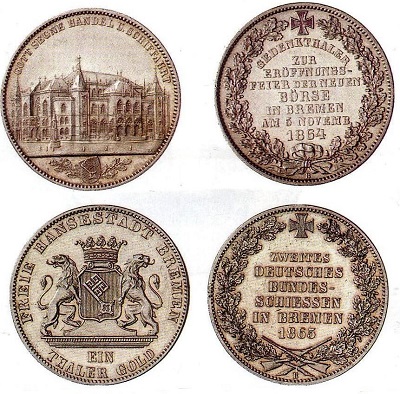 Laut Obrigkeitlicher Verordnung vom 25. Juli 1870 war der Taler Gold in Bremen gesetzliches Zahlungsmittel, ebenso hat man in der Hansestadt britische, US-amerikanische, russische, französische und weitere aktuell hergestellte Goldmünzen anerkannt und mit ihnen Geschäfte abgewickelt. Die erwähnte Verordnung war eine Übergangslösung, denn schon bald wurde im neu gegründeten Deutschen Reich die Mark eingeführt und mit dem Nebenherbestehen der unterschiedlichsten Nominale Schluss gemacht. Sehr zum Leidwesen der Münzsammler verschwanden unzählige münz- und kunstgeschichtlich interessante Münzen auf Nimmerwiedersehen in den Tiegeln der Präge- und Scheideanstalten.