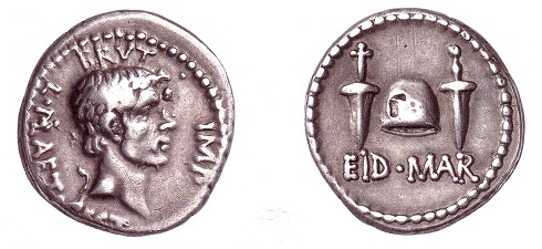 Mit dem Kind war M. Iunius Brutus gemeint, der sich mit weiteren streng republikanisch gesonnenen Senatoren gegen den Staatsmann, Feldherrn und Diktator Caesar auf Lebenszeit verschworen hatte, weil sie fürchteten, er könne eine Monarchie errichten. Der Cäsarenmörder ließ sich, stolz wie er war, auf einem berühmten und gelegentlich auch im Münzhandel angebotenen Silberdenar mit seinem Kopf darstellen. Zwei Dolche auf der Rückseite flankieren eine Freiheitsmütze, lateinisch pileus libertatis. Sie sind unleugbare Hinweise auf die Bluttat, ebenso die abgekürzte Inschrift EID MAR, eidus martiis, mit dem das Datum, die Iden des März, genannt wird.