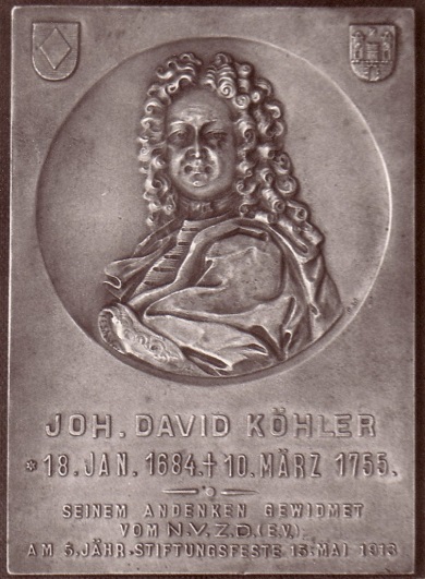 In Colditz kann man einiges aus der Lebensgeschichte des schreibfleißigen Gelehrten erfahren, über seine Studienjahre an der Fürstenschule Sankt Afra zu Meißen und an der Universität zu Wittenberg, dann über seine Lehrtätigkeit an der Universität zu Altdorf bei Nürnberg, wo er 1729 die mit Beschreibungen ausgewählter Münzen und Medaillen samt historisch-biographischen Erklärungen und sogar Verkaufsangeboten an Sammler gespickten "Münzbelustigungen" herauszubringen begann. Köhler nahm 1735 einem ehrenvollen Ruf an die Universität in Göttingen an, wo er 1755 hochgeachtet starb.