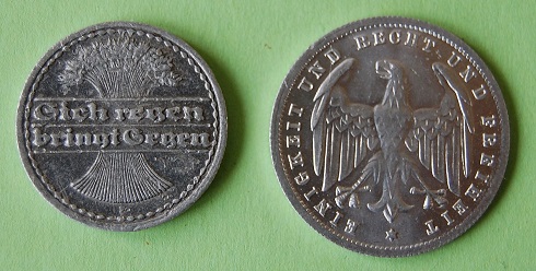 In der Weimarer Republik galten die aus Kaisers Zeiten überkommenen Goldmünzen zu 10 und 20 Mark, ferner die Ein-, Zwei- und Drei-Mark-Stücke aus Silber mit dem kronengeschmückten Adler sowie die kupfernen Ein- und Zweipfennigstücke weiter. Da neue Münzen nicht schnell genug bereitgestellt werden konnten, war es gestattet, weiterhin mit Hartgeld zu bezahlen, auf denen Fürstenbildnisse und der kaiserliche Adler abgebildet sind. Hingegen wurden zum Teil noch aus der Zeit der Monarchie stammende Kleinmünzen aus Nickel, Aluminium, Eisen und Zink außer Kurs gesetzt. Das verwendete Material endete ruhmlos in den Schmelztiegeln der metallverarbeitenden Industrie.