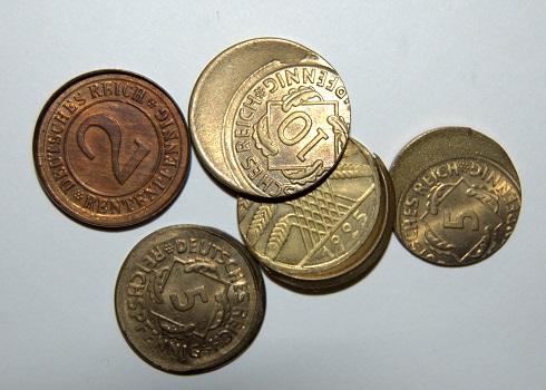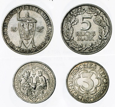 Im Januar 1925 wurden in allen sechs deutschen Münzstätten wurden folgende - von uns gerundete - Summen erzeugt: für 15,8 Millionen Reichsmark (RM) Einmarkstücke, für 2,9 Millionen RM Dreimarkstücke, für 401 000 RM Einpfennigstücke, für 305 000 RM Zweipfennigstücke, für 1,6 Millionen RM Zehnpfennigstücke und für 55 000 RM Fünfzigpfennigstücke. Obwohl solch enorme Stückzahlen hergestellt wurden, ist die Zahl der erhalten gebliebenen Münzen aus dieser Zeit relativ gering. Wenn makellose Exemplare im Handel angeboten werden, erzielen sie heute beachtliche Preise.