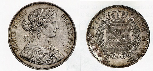 Unschwer lassen sich weitere Münzen dieser Art finden. So ist Eichenlaub in reichlichem Maße auf bayerischen Kurs- und Geschichtsmünzen aus der Zeit König Ludwigs I. und seiner Nachfolger zu beobachten. Gelegentlich kommen Kombinationen von Lorbeerzweigen und Eichenlaub vor, etwa auf dem königlich-sächsischen Verfassungstaler von 1831 oder einem Münzbesuchstaler aus Hannover von 1854. Ein Frankfurter Doppeltaler von 1840 anlässlich der fünften Säkularfeier des städtischen Münzrechts und der Eröffnung der Neuen Münze zeigt auf der Wertseite einen prächtigen Eichenkranz. Wo immer die Francofurtia als Symbolfigur der Mainmetropole erscheint, trägt sie einen Eichenkranz im Haar.