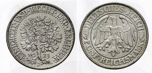 Im Zusammenhang mit der Suche nach neuen Bildern für das silberne Kursgeld der Weimarer Republik ist in den Akten des Reichskunstwarts Edwin Redslob von Schiffen und Brunnen, aber auch von Bäumen die Rede. Während die ersten beiden Motive nicht umgesetzt wurden, von einer Münze zur Hundertjahrfeier von Bremerhaven (1928) und einigen Probeprägungen abgesehen, wurde die auch als "Schicksalsbaum der Deutschen" gefeierte Eiche in voller Größe auf ein Fünf-Mark-Stück gesetzt. Dass ein Eichbaum eine ganze Münzseite einnimmt, war neu und ungewohnt. Hingegen ist Eichenlaub als Schmuck von Münzen seit dem 19. Jahrhundert beliebt.