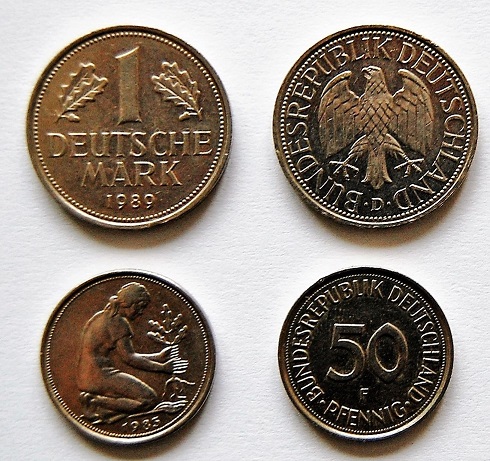 Auf Pfennigen, Groschen, Fünfzigpfennig- sowie Ein- und Zwei-Mark-Stücken der DDR findet man ebenfalls Eichenblätter. Hingegen ist das ganz frühe DDR-Hartgeld mit einer Getreideähre geschmückt, die auf einem Zahnkranz liegt. Pikanterweise stammt dieses Symbol für den 1948 beschlossenen und für die damalige Sowjetische Besatzungszone gültigen Zweijahresplan aus dem Jahr 1943, also aus der Nazizeit. Niemand wusste oder durfte nach ihrer Überwindung sagen, dass das Bild auf den an der Preußischen Staatsmünze Berlin tätigen Stempelschneider und Graveur Franz Krischker zurück geht, der für viele Münzen der Weimarer Republik und des NS-Staates verantwortlich zeichnet.