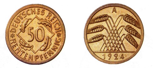 Der gleich nach dem Ende der Inflation auf den Markt geworfenen Münze war nur eine kurze Lebensdauer beschieden, weil sie, quasi über Nacht nach einem Entwurf von Waldemar Raemisch recht einfach gestaltet, häufig gefälscht wurde und nur geringes Ansehen besaß. Das mit der Wertzahl "50" und Getreideähren geschmückte Fünfzigpfennigstück wurde bereits 1928 eingezogen und am 1. Dezember 1929 außer Kurs gesetzt. Bestimmte Ausgaben von 1923 bis 1925 erreichen, wenn sie echt und dazu noch herausragend erhalten sind, vierstellige Beträge.