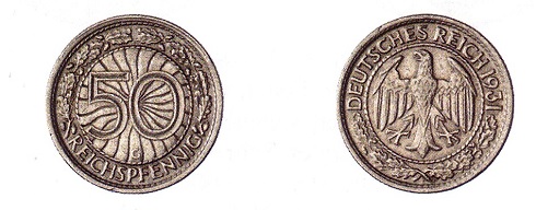 Eine der merkwürdigsten und umstrittensten deutschen Kleinmünzen der frühen Weimarer Republik ist das 1923 bis 1925 in großer Zahl hergestellte Fünfzigpfennigstück. Für die gigantische Aufgabe, das Deutsche Reich mit neuen Münzen zu versorgen, standen sechs Münzstätten zur Verfügung, erkennbar an den aus der Kaiserzeit übernommenen Münzbuchstaben: Berlin (A), Hamburg (J), München (D), Muldenhütten (E), Stuttgart (F) und Karlsruhe (G).