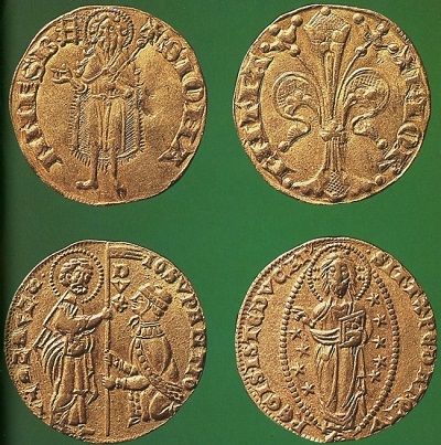 Die reiche italienische Handelsstadt Florenz hatte bereits 1252 eine neuartige Goldmünze mit dem Gewicht von 3,537 Gramm herausgebracht, die nach der Lilie (flos) auf der Vorderseite, dem redenden Wappen der Stadt, Florenus oder Floren genannt wurde. Auf der Rückseite wird Johannes der Täufer stehend als Stadtheiliger mit dem Lamm Gottes dargestellt, ergänzt durch die Umschriften FLORENTIA und S. IOHANNES B(APTISTA). Kleine Zeichen hinter der Umschrift lassen erkennen, wer die verantwortlichen Münzherren waren. Dies erlaubt eine zeitliche Zuordnung der undatierten Goldstücke. Möglich war die Prägung der ungewöhnlich erfolgreichen und weit verbreiteten Münze, weil im Zusammenhang mit den Kreuzzügen viel Gold nach Italien strömte, damals das kulturell und wirtschaftlich führende Land in Europa. Außerdem ließ sich der Handel mit dem Oströmischen Reich, wo man bevorzugt mit geprägtem Gold bezahlte, mit den hochwertigen Gulden bequemer abwickeln als mit Silberstücken, die damals nur die Größe von Groschen und Pfennigen hatten, denn die Taler wurden erst im späten 15. Jahrhundert erfunden. Die Florene erfreuten sich schon bald großer Beliebtheit und wurden in vielen anderen Ländern nachgeahmt. Im Römisch-deutschen Reich war der Goldgulden bereits im frühen 14. Jahrhundert Hauptzahlungsmittel. Hier hat man die Lilie durch die Wappen der Münzherren oder einen Reichsapfel sowie Johannes der Täufer durch die Muttergottes und andere Heilige beziehungsweise Herrscherbilder ersetzt.