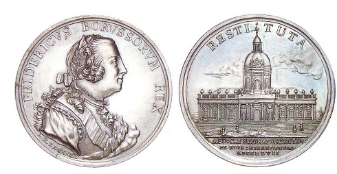 Interesse verdienen Medaillen, mit denen die Bauten des preußischen Königs bekannt gemacht wurden. So wurde 1747 die barocke Schloss- und Domkirche am Lustgarten durch eine von Ludwig Heinrich Barbiez geschaffene Prägung mit dem königlichen Bildnis auf der Vorderseite und der Ansicht des mit einer Kuppel geschmückten Gotteshauses auf der Rückseite dokumentiert. Das lateinische Wort auf der Rückseite RESTITUTA weist darauf hin, dass die alte, zur Ruine verkommene Hofkirche auf Befehl des Königs abgerissen und durch den Knobelsdorff'schen Neubau ersetzt wurde. Später von Karl Friedrich Schinkel erweitert, wurde das Gebäude in der Zeit Kaiser Wilhelms II. abgetragen und durch den Dom mit der riesigen, die Silhouette der Stadt beherrschende Kuppel ersetzt. Als er 1905 eröffnet wurde, hat man ihm zahlreiche Medaillen gewidmet.