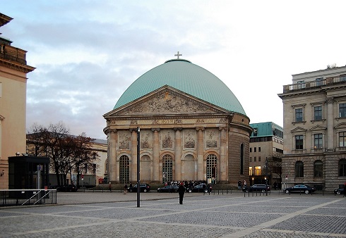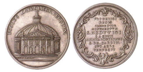 Auch die Errichtung der katholischen Hedwigskirche zwischen Opernhaus und Bibliothek war die Prägung von Medaillen wert. Die dreiteilige Serie beginnt mit einer ebenfalls von Barbiez geschaffenen Medaille von 1747 auf die Grundsteinlegung mit königlichem Bildnis und fünfzeiliger Inschrift. Die nächste Medaille von Peter Paul Werner ist undatiert und zeigt eine Ansicht des nach dem Pantheon in Rom nachempfundenen Gotteshauses. Als 1773 die der Heiligen Hedwig, der Schutzpatronin Schlesiens, gewidmete Kirche vollendet war, erschien eine dritte Medaille, auf der Musen dem von Friedrich II. nach Berlin geholten Theatermaler und Dekorateur Bernardino Galliari huldigen. Im Hintergrund ist die Hedwigskirche zu erkennen.