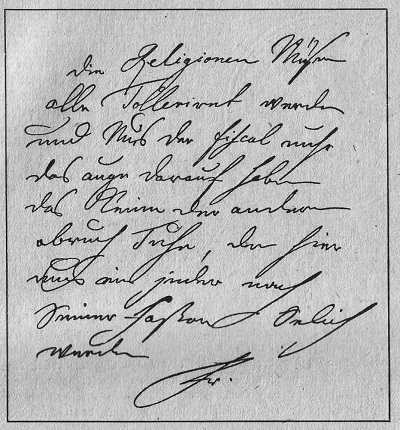 "Ich bin dem Kapitel der Kollegiatskirche in Breslau sehr dankbar für die Gefälligkeit, womit es mir einige seiner Reliquien der heiligen Hedwig abgetreten hat, und werde Sorge tragen, dass diese vom Bischof von Ermland bei Gelegenheit der Einweihung der neuen Kirche in Berlin zugestellt werden", heißt es in einem Dankschreiben vom 8. Oktober 1773 an die katholische Geistlichkeit in Breslau für den Erhalt von Reliquien der Heiligen Hedwig. "Sie werden nicht verfehlen, dem Kapitel meinen aufrichtigen Dank auszusprechen und hinzuzufügen, dass ich mir vorbehalte, ihm seinerzeit meine Erkenntlichkeit zu beweisen. In einigen Tagen soll die Kirche gesegnet, eingeweiht und der Mummenschanz gefeiert werden. Glauben die Leute jetzt noch nicht an meine Toleranz, so sind sie sehr schwierig. Weder in Bamberg, Würzburg noch in Salzburg wird eine lutherische oder kalvinistische Kirche gebaut werden. Ihr andern habt, wer Ihr auch immer zu sein möget, immer noch die Wut des hitzigen Fiebers des Fanatismus in Euch: Ihr seid nur halbe Menschen."