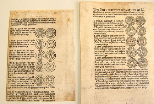 Bevor es den Buchdruck gab, hat man vor minderwertigen oder ganz und gar falschen Münzen mündlich oder durch handschriftliche Mitteilungen an Rathäusern und auf öffentlichen Plätzen gewarnt. Gesetzestexte vermerkten, welche drakonischen Strafen für Münzverbrechen ausgesprochen und vollstreckt wurden. Nachdem der Buchdruck um 1450 von Johannes Gutenberg erfunden wurde und seinen Siegeszug durch die Länder angetreten hatte, wurde er auch zur Herstellung von Flugblättern genutzt. Die wenigen Einblattdrucke sind im "Gesamtkatalog der Wiegendrucke" (GW) publiziert. Er umfasst alle bis 1500 erschienenen Inkunabeln, also Wiegendrucke, und kann weltweit auch im Internet unter der Adresse www.gesamtkatalogderwiegendrucke.de gelesen und genutzt werden.