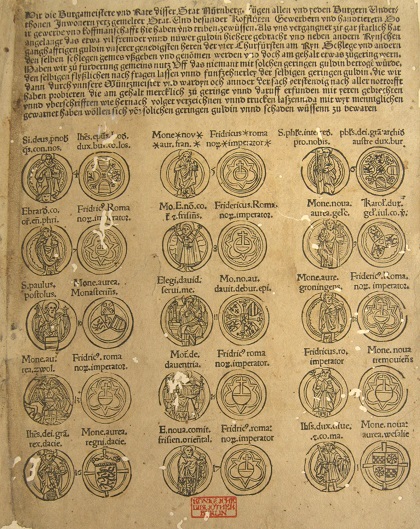 Ein anderer numismatisch interessanter Einblattdruck aus der Inkunabelzeit stammt aus Nürnberg und wurde um 1490 in Straßburg von Johann Prüss gedruckt. Bürgermeister und Rat lassen Bürger und Einwohner dieser Stadt und besonders Kaufleute, Gewerbetreibende und Handwerker wissen, dass in letzter Zeit viele fremde und neue Gulden hierher gebracht wurden, die im Gehalt zu gering sind. "Haben wir zur fürderung gemeins nutz Off das niemant mit solchen geringen guldin betrogen würde, den selbigen flyßlichen nach fragen lassen vnnd funfzehnerley der selbigen geringen guldin die wir dann durch vnsere Müntzmeister vnd wardyn och annder der sach verstendig nach aller nottorfft haben probieren. die am gehalt mercklich zu geringe vnnd daruff erfunden mit yren gebrechten vnnd vberschrifften wie hernach volget verzeichnen vnnd trucken laszen. da mit wyr menniglichen gewarnet haben wöllen sich vor solichen geringen guldin vnnd schaden wüssenn zu bewaren." Bei den 15 Münzabbildungen fehlen die Umschriften, allerdings sagen kurze Beschreibungen, um welches Geldstück es sich jeweils handelt. Erfasst sind mit Heiligendarstellungen sowie mit dem Reichsapfel im Dreipass und mit Landeswappen geschmückte Gulden, die sich gut bestimmten Fürstentümern und Städten zuordnen lassen.