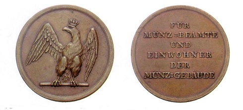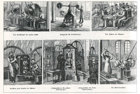 Über das Innenleben der Berliner Münze im frühen 19. Jahrhundert sind wir recht genau durch zeitgenössische Beschreibungen informiert. Im Jahr 1823 besuchte der badische Münzwardein Ludwig Kachel im Auftrag seines Großherzogs mehrere deutsche Münzstätten, um Informationen für die Verbesserung der eigenen Münzproduktion zu sammeln. Kachel berichtete nach Karlsruhe von zwei Berliner Geldfabriken - der Hauptmünze am Werderschen Markt und der "Neuen Münze" in der Münzstraße 10 bis 12 unweit des Alexanderplatzes, die 1752 auf Geheiß Friedrichs II., des Großen, errichtet worden war. Der Besucher registrierte Anstrengungen zur Modernisierung der Maschinen und Arbeitsabläufe, und ihm fiel auf, dass Altertümliches und Modernes nebeneinander existierten. "Die Klippwerke, worauf in Berlin die Einpfennigstücke mit dem Hammer ausgeschlagen werden, sind bekannt. In dieser Werkstätte glaubt man sich in ein früheres Jahrhundert geweht in Ansehung der Werkzeuge als [auch] der Costüme der Arbeiter. […] Letztere sind mit Blechhauben und langen Lederschürzen bewaffnet, um sich gegen Stahlstücken zu schützen, welche von Zeit zu Zeit der Hammer von dem Stempel abschlägt. Man hat diese einfache Prägung für die kleineren Kupferpfennige beibehalten, weil sie die wohlfeilste ist."