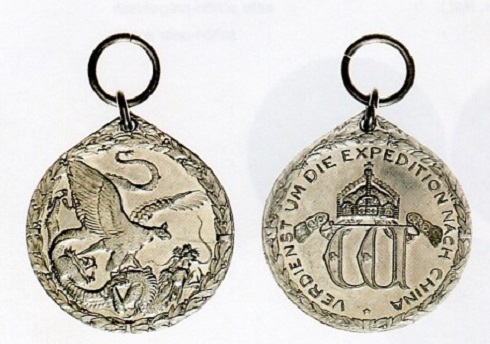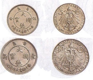 Zweisprachig sind auch die mit der Jahreszahl 1909 datierten Fünf-Cent- und Zehn-Cent-Münzen für das 515 Quadratmeter große Pachtgebiet Kiautschou mit der Hauptstadt Tsingtau. Das Deutsche Reich hatte Gebiet 1898 vom chinesischen Kaiser für 99 Jahre als Hafen und Handelsplatz gepachtet. Die chinesischen Schriftzeichen auf der Vorderseite bedeuten "Kaiserlich deutsche Münze 20 (beziehungsweise 10) Stück auf einen Dollar Großes Geld". Das Deutsche Reich wird durch den sogenannten Marineadler repräsentiert, der einen Anker in den Krallen hält. Außerdem ist die Schrift DEUTSCH KIAUTSCHOU GEBIET um den Adler gelegt.