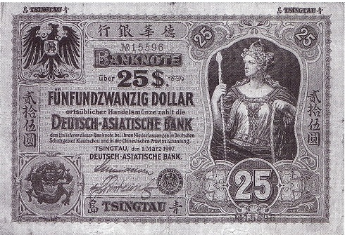 Wie die Münzen von Kiautschou sind auch die Geldscheine der 1889 gegründeten Deutsch-Asiatischen Bank zweisprachig - deutsch und chinesisch. Versehen mit den Jahresangaben 1907 und 1917 lauten sie nicht auf Mark oder Rupien, sondern auf Dollar und Tael. In Anlehnung an das Reichsgeld schmückt eine gekrönte Germania diese mit dem deutschen Reichsadler und dem chinesischen Drachen gezeichneten Noten. Da die Scheine kaum in den Geldverkehr gelangten und die Auflage fast vollständig vernichtet wurde, nachdem sich Deutschland aus dem Reich der Mitte hatte zurückziehen müssen, zählen diese vorzüglich gestalteten Banknoten zu den großen und sehr teuer bezahlten Geldscheinen überhaupt.