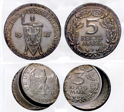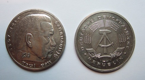 Im Archiv der Kreditanstalt für Wiederaufbau am Gendarmenmarkt in Berlin wird eine besonders extreme Zwittermünze aufbewahrt. Sie kombiniert den auf Münzen der NS-Zeit abgebildeten Kopf des Reichspräsidenten Paul von Hindenburg mit dem DDR-Wappen. Unter welchen Umständen dieser Zwitter im damaligen VEB Münze der DDR entstanden ist, kann nicht geklärt werden. Schaut man die Münzgeschichte des bis 1990 existierenden zweiten deutschen Staates an, dann tauchen dort weitere Kombinationen von nicht zusammen passenden Vorder- und Rückseiten sowie Randschriften auf, die für andere Geldstücke bestimmt waren. Es gibt Sammler, die solche Stücke suchen und sie gut bezahlen. Obwohl es strenge Bestimmungen gibt, dass Verprägungen und falsche Stempelkopplungen eine Prägeanstalt nicht verlassen dürfen, sondern dort vernichtet werden müssen, gelang und gelingt ihnen mitunter der Weg nach draußen. Sonst könnte der Handel diese numismatischen Missgeburten zur Freude von Raritätenjägern nicht anbieten.