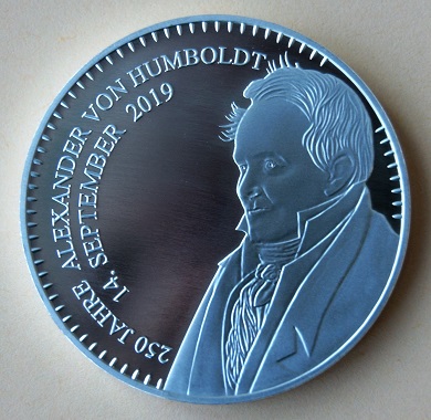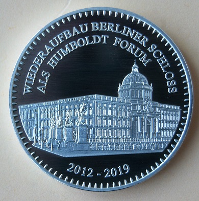 Mit Blick auf die Eröffnung des Humboldt Forum in zwei Jahren als Museum der außereuropäischen Kulturen und der Sammlungen im Besitz der Humboldt-Universität prägt die Staatliche Münze Berlin eine Silbermedaille mit der Ansicht des wiederaufgebauten Berliner Schlosses sowie dem Bildnis des Weltreisenden Alexander von Humboldt. Die von Laura Nicklaus und Stefanie Lindner gestaltete Medaille wiegt eine Unze, also etwa 33 Gramm, und hat einen Durchmesser von 37 Millimetern, ist also etwas kleiner als ein alter Silbertaler. Die neue Medaille macht auf ein bedeutendes Denkmal der preußischen und deutschen Geschichte und Kunst aufmerksam und dürfte nicht nur Preußen-Fans, sondern auch Sammler interessieren, die sich auf das Thema "Architectura in nummis" spezialisiert haben. Da die Medaille mit Alexander von Humboldt auch einen großen Gelehrten ehrt, passt sie auch in Fächer zum Thema Wissenschaft auf Münzen und Medaillen. Die neue Silberprägung ist eine Hommage an Alexander von Humboldt, der am 14. September 1769 geboren wurde. 2019 ist das dann 250 Jahre her. Vom Verkaufspreis gehen fünf Euro an den Förderverein Berliner Schloss.