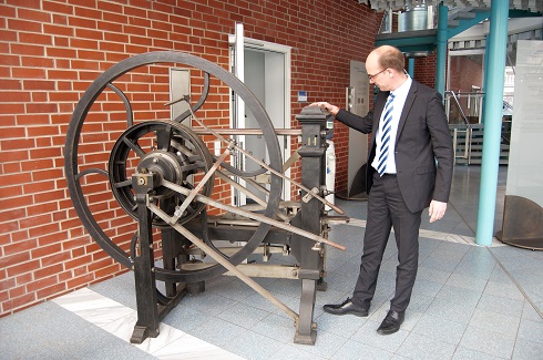 Liebend gern möchte Andreas Schikora eine im betriebseigenen Münzmuseum stehende Prägemaschine wieder in Gang bringen. Die Kniehebelpresse der Grevenbroicher Firma Uhlhorn stammt aus dem Jahr 1833 und ist laut Fabrikschild die Nummer 86 in der erfolgreichen Serie. Bis nach 1945 im damaligen VEB Münze der DDR eingesetzt, ist die Prägemaschine ein interessantes Denkmal der Industriegeschichte, und wenn sie eines Tages wieder angeworfen wird, ist ihr ganz bestimmt große Aufmerksamkeit sicher.